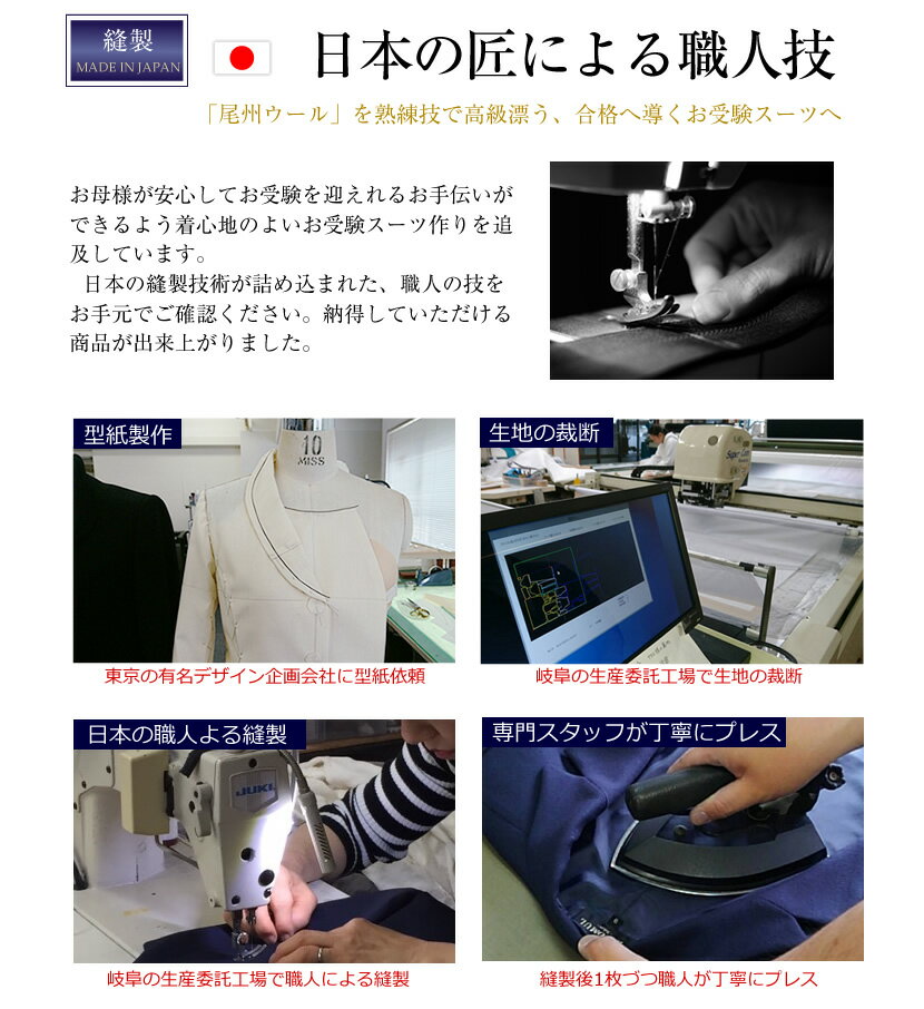 豊富なデザイン・サイズ展開で、生地にはもちろんのこと、縫製・着心地・シルエットにこだわり、幼稚園受験・小学校受験・中学校受験と様々なシーンに合うデザインを撮り揃いえております。